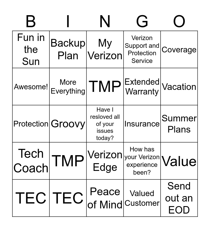 This bingo card has a free space and 24 words: TMP, TEC, TMP, TEC, Coverage, Fun in the Sun, Awesome!, Backup Plan, Insurance, Verizon Edge, Extended Warranty, Protection, How has your Verizon experience been?, Value, More Everything, Valued Customer, Summer Plans, My Verizon, Vacation, Groovy, Send out an EOD, Tech Coach, Verizon Support and Protection Service and Peace of Mind.