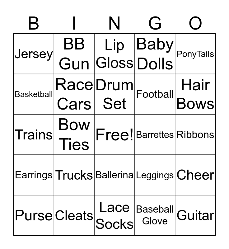 This bingo card has a free space and 24 words: Trucks, Cleats, Drum Set, Purse, PonyTails, Jersey, Basketball, BB Gun, Barrettes, Ballerina, Football, Trains, Leggings, Cheer, Race Cars, Baseball Glove, Ribbons, Lip Gloss, Hair Bows, Bow Ties, Guitar, Earrings, Baby Dolls and Lace Socks.