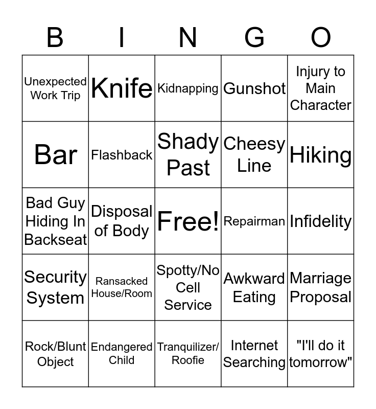 This bingo card has a free space and 24 words: Ransacked House/Room, Endangered Child, Shady Past, Rock/Blunt Object, Injury to Main Character, Unexpected Work Trip, Bar, Knife, Repairman, Spotty/No Cell Service, Cheesy Line, Bad Guy Hiding In Backseat, Awkward Eating, Marriage Proposal, Flashback, Internet Searching, Infidelity, Kidnapping, Hiking, Disposal of Body, "I'll do it tomorrow", Security System, Gunshot and Tranquilizer/ Roofie.