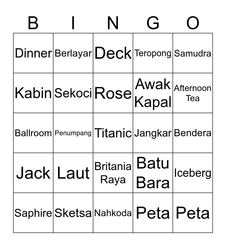 This bingo card has a free space and 24 words: Laut, Sketsa, Rose, Saphire, Samudra, Dinner, Kabin, Berlayar, Jangkar, Britania Raya, Awak Kapal, Ballroom, Batu Bara, Iceberg, Sekoci, Peta, Bendera, Deck, Afternoon Tea, Penumpang, Peta, Jack, Teropong and Nahkoda.