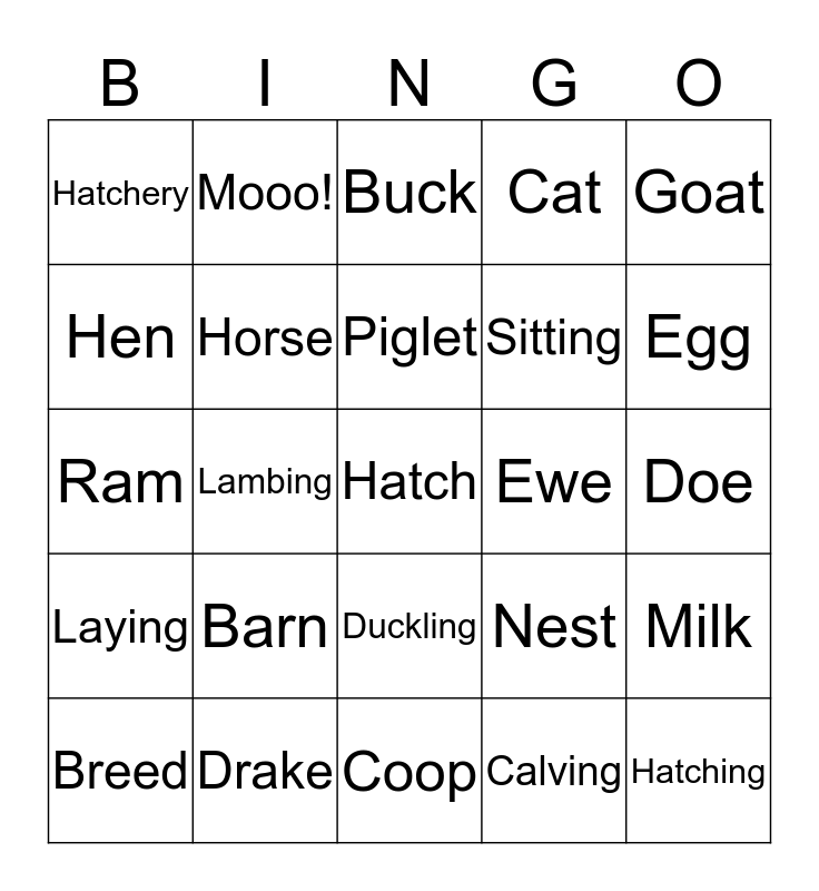 This bingo card has 35 words: Dog, Chick, Rooster, Horse, Duckling, Cat, Hen, Goose, Piglet, Lamb, Ram, Goat, Incubator, Cow, Hatchery, Ewe, Calving, Lambing, Laying, Hatch, Nest, Breed, Milk, Drake, Buck, Egg, Hatching, Bullock, Sitting, Doe, Farm, Coop, Barn, Mooo! and Bull.