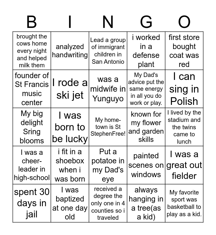 This bingo card has a free space and 24 words: i fit in a shoebox when i was born, I was baptized at one day old, was a midwife in Yunguyo, spent 30 days in jail, first store bought coat was red, brought the cows home every night and helped milk them, founder of St Francis music center, analyzed handwriting, known for my flower and garden skills, Put a potatoe in my Dad's eye, My Dad's advice put the same energy in all you do work or play., My big delight Sring blooms, painted scenes on windows, I was a great out fielder, I rode a ski jet, always hanging in a tree(as a kid), I lived by the stadium and the twins came to lunch, Lead a group of immigrant children in San Antonio, I can sing in Polish, I was born to be lucky, My favorite sport was basketball to play as a kid., I was a cheer-leader in high-school, i worked in a defense plant and received a degree the only one in 4 counties so i traveled.