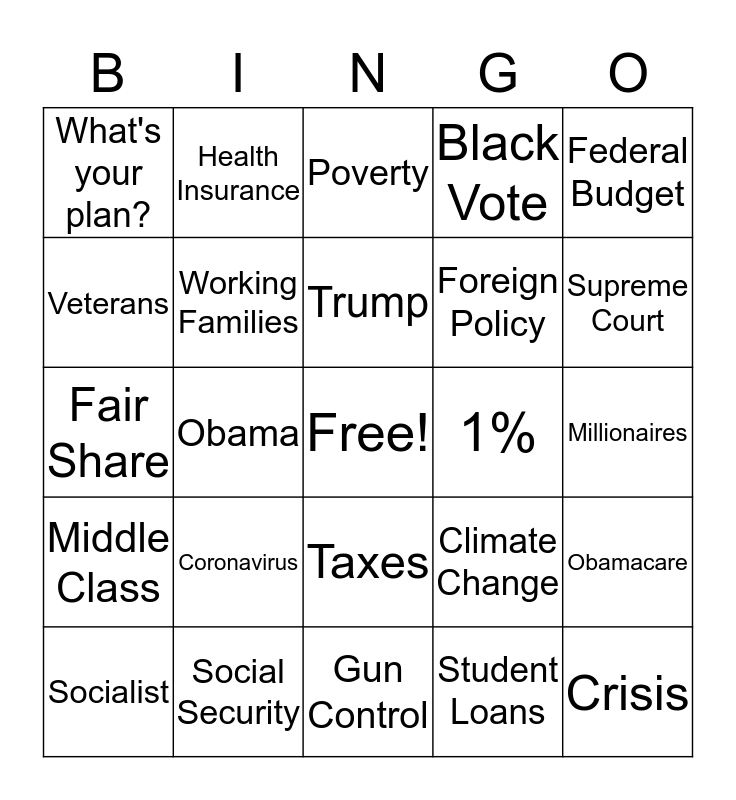 This bingo card has a free space and 24 words: Socialist, Coronavirus, Trump, Student Loans, Federal Budget, What's your plan?, Health Insurance, Poverty, 1%, Millionaires, Fair Share, Working Families, Climate Change, Obamacare, Veterans, Social Security, Gun Control, Black Vote, Supreme Court, Middle Class, Obama, Taxes, Foreign Policy and Crisis.