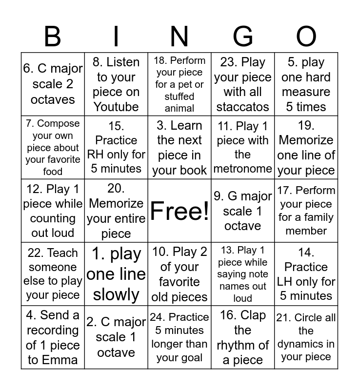 This bingo card has a free space and 24 words: 1. play one line slowly, 2. C major scale 1 octave, 3. Learn the next piece in your book, 4. Send a recording of 1 piece to Emma, 5. play one hard measure 5 times, 6. C major scale 2 octaves, 7. Compose your own piece about your favorite food, 8. Listen to your piece on Youtube, 9. G major scale 1 octave, 10. Play 2 of your favorite old pieces, 11. Play 1 piece with the metronome, 12. Play 1 piece while counting out loud, 13. Play 1 piece while saying note names out loud, 14. Practice LH only for 5 minutes, 15. Practice RH only for 5 minutes, 16. Clap the rhythm of a piece, 17. Perform your piece for a family member, 18. Perform your piece for a pet or stuffed animal, 19. Memorize one line of your piece, 20. Memorize your entire piece, 21. Circle all the dynamics in your piece, 22. Teach someone else to play your piece, 23. Play your piece with all staccatos and 24. Practice 5 minutes longer than your goal.