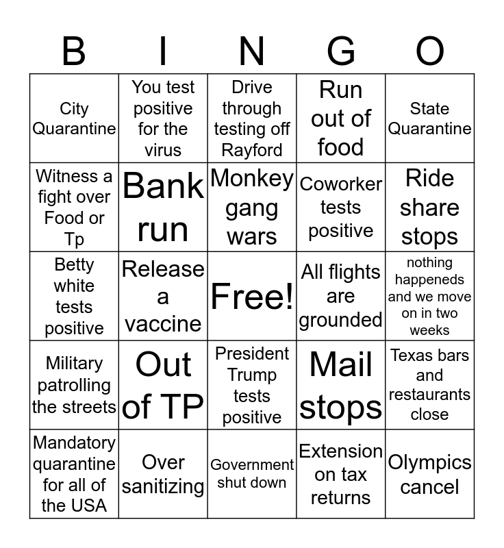 This bingo card has a free space and 24 words: Out of TP, Over sanitizing, Monkey gang wars, Mandatory quarantine for all of the USA, State Quarantine, City Quarantine, Witness a fight over Food or Tp, You test positive for the virus, All flights are grounded, President Trump tests positive, Coworker tests positive, Betty white tests positive, Mail stops, Texas bars and restaurants close, Bank run, Extension on tax returns, nothing happeneds and we move on in two weeks, Drive through testing off Rayford, Ride share stops, Release a vaccine, Olympics cancel, Military patrolling the streets, Run out of food and Government shut down.