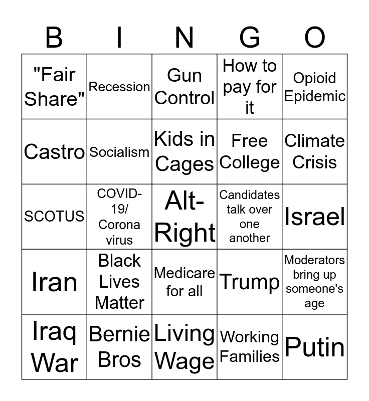 This bingo card has 25 words: Black Lives Matter, Living Wage, Kids in Cages, Iraq War, Opioid Epidemic, "Fair Share", Castro, Recession, Candidates talk over one another, Medicare for all, Free College, SCOTUS, Trump, Moderators bring up someone's age, Socialism, Putin, Israel, Gun Control, Climate Crisis, COVID-19/ Corona virus, Alt-Right, Bernie Bros, Iran, How to pay for it and Working Families.