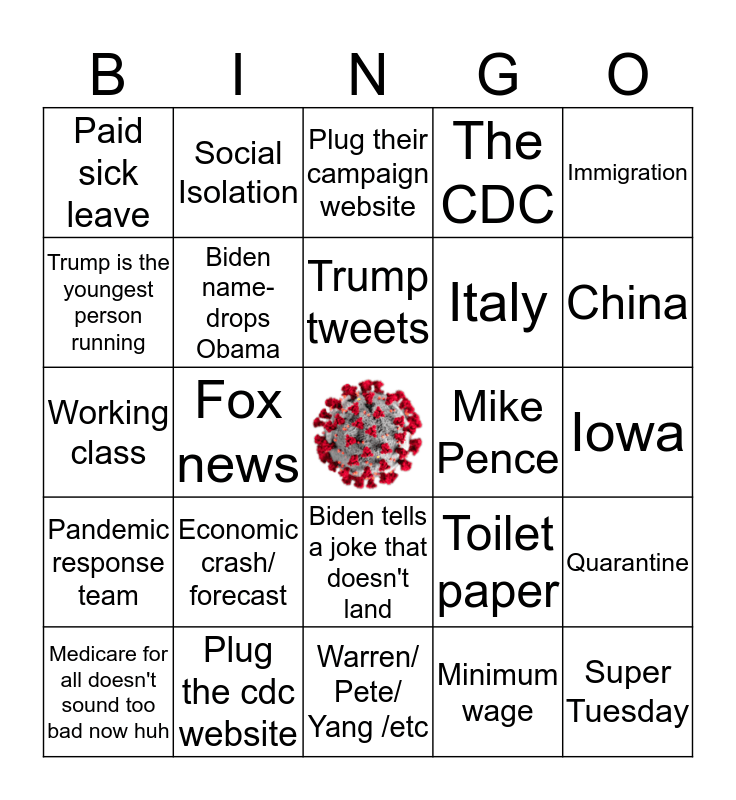 This bingo card has a free space and 39 words: Biden goes off on a tangent, Bernie Bongos, Candidates interrupt each other, Biden name-drops Obama, Medicare for all doesn't sound too bad now huh, Biden tells a joke that doesn't land, Trump tweets, 1%, Immigration, Pandemic response team, Fox news, The CDC, Super Tuesday, Iowa, Mike Pence, Economic crash/ forecast, Spring Break, Paid sick leave, "revolution", Toilet paper, Trump is the youngest person running, Warren/ Pete/ Yang /etc, Italy, China, Technical difficulties, Joke about how there's no audience, Quarantine, Iraq War, Social Isolatio, Social Isolation, Iraq war, joke about the lack of an audience, Plug their campaign website, Plug the cdc website, Minimum wage, The GOP, Quarantine, Working class and Airlines.