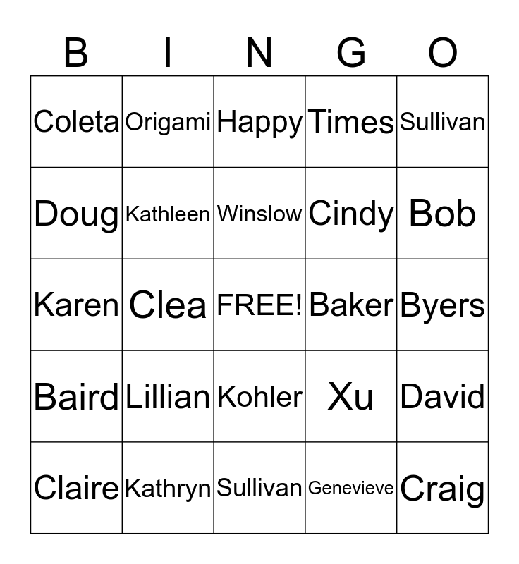 This bingo card has a free space and 24 words: Lillian, Kathryn, Winslow, Claire, Sullivan, Coleta, Doug, Origami, Baker, Kohler, Cindy, Karen, Xu, David, Kathleen, Genevieve, Byers, Happy, Bob, Clea, Craig, Baird, Times and Sullivan.