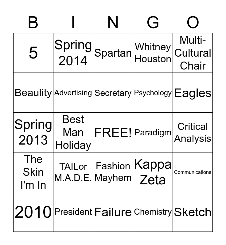 This bingo card has a free space and 24 words: TAILor M.A.D.E., President, Secretary, 2010, Multi-Cultural Chair, 5, Beaulity, Spring 2014, Paradigm, Fashion Mayhem, Psychology, Spring 2013, Kappa Zeta, Communications, Advertising, Chemistry, Critical Analysis, Spartan, Eagles, Best Man Holiday, Sketch, The Skin I'm In, Whitney Houston and Failure.