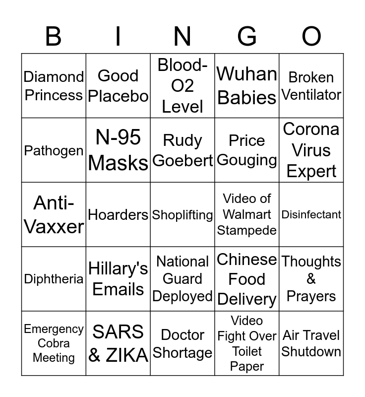 This bingo card has 40 words: Looting, Anti-Vaxxer, Swab Testing, N-95 Masks, SARS & ZIKA, National Guard Deployed, Rudy Goebert, Social Distancing, Broken Ventilator, Diphtheria, Hoarders, Wuhan Babies, Shoplifting, Disinfectant, Video of Walmart Stampede, Hillary's Emails, Bat Soup, Diamond Princess, State of Emergency, Blood-O2 Level, Thoughts & Prayers, Video Fight Over Toilet Paper, Price Gouging, Pathogen, Epstein didn't kill himself, Any Covid besides 19, In Time of Crisis, Homemade Hooch, Air Travel Shutdown, Dead "A" List Celebrity, Home Testing Kit, Emergency Cobra Meeting, Virtual Happy Hour, Chinese Food Delivery, Corona Virus Expert, Doctor Shortage, Live report from Wawa, Hippa Violation, Good Placebo and Corona Virus "Sale".