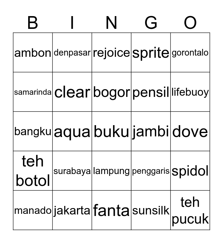 This bingo card has a free space and 24 words: surabaya, jakarta, bogor, manado, gorontalo, ambon, samarinda, denpasar, jambi, lampung, pensil, bangku, penggaris, spidol, clear, sunsilk, dove, rejoice, lifebuoy, aqua, teh pucuk, teh botol, sprite and fanta.