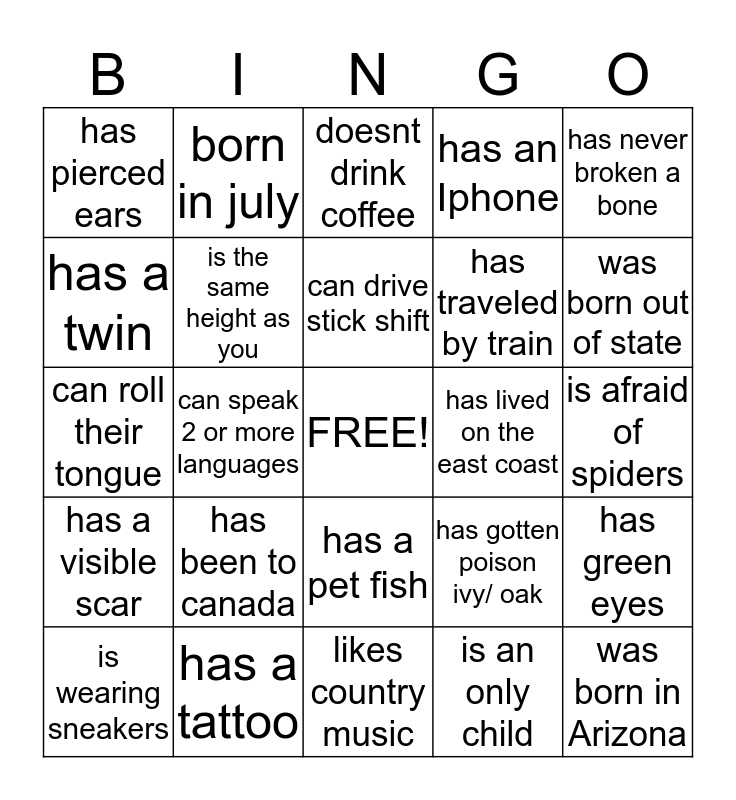 This bingo card has a free space and 24 words: has been to canada, has a tattoo, can drive stick shift, is wearing sneakers, has never broken a bone, has pierced ears, has a twin, born in july, has lived on the east coast, has a pet fish, has traveled by train, can roll their tongue, has gotten poison ivy/ oak, has green eyes, is the same height as you, is an only child, is afraid of spiders, doesnt drink coffee, was born out of state, can speak 2 or more languages, was born in Arizona, has a visible scar, has an Iphone and likes country music.
