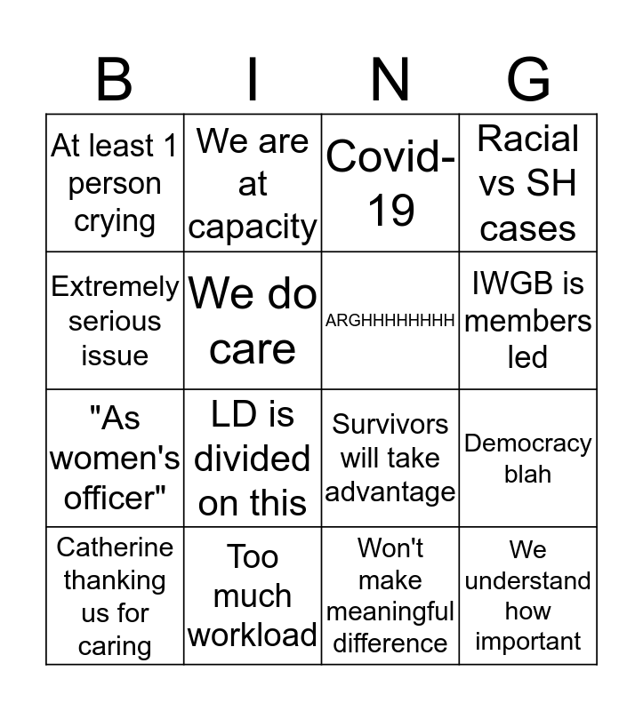 This bingo card has 16 words: Catherine thanking us for caring, Too much workload, Covid-19, Racial vs SH cases, Extremely serious issue, We are at capacity, Survivors will take advantage, Democracy blah, At least 1 person crying, We do care, Won't make meaningful difference, IWGB is members led, "As women's officer", LD is divided on this, ARGHHHHHHHH and We understand how important.