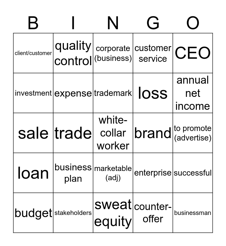 This bingo card has 75 words: invoice, finance (noun), corporate (business), market testing, downsizing (verb), asset, venture capital, entrepreneur, partner; member, Human Resources, businessman, effective, trademark, investment, ethics, trade, marketing (noun), white-collar worker, advertisement, CEO, target market, sale, expense, quality control, customer service, franchise, mission statement, accounting (noun), branch, chamber of commerce, recruitment, income, profit, supply chain, enterprise, annual net income, loss, to launch, report, to promote (advertise), counter-offer, research and development (R +D), to test, supply and demand, offer, market, equity, budget, client/customer, business, charge ($), agreement, marketable (adj), item, merger, failure, goals, to negotiate, shareholder, revenue, income, wholesale (adjective), business plan, (deal/interaction between the seller/provider and the customer/purchaser), the survey, deadline, to invest, brand, consumer, to loan, niche market, successful, loan, stakeholders, management, sweat equity and copyright.