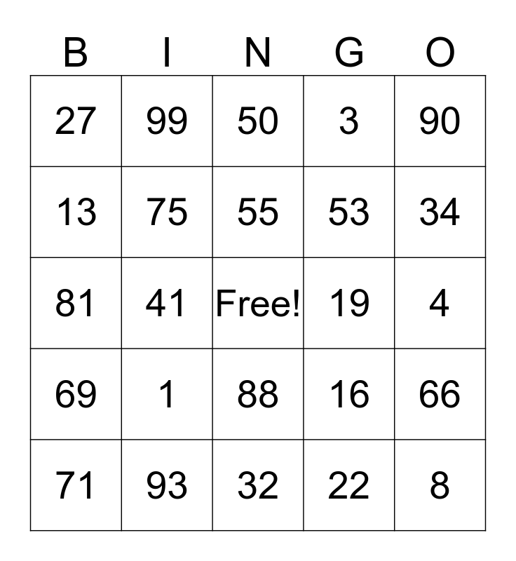 This bingo card has a free space and 24 words: 1, 93, 55, 71, 90, 27, 13, 99, 19, 88, 53, 81, 16, 66, 75, 22, 4, 50, 34, 41, 8, 69, 3 and 32.