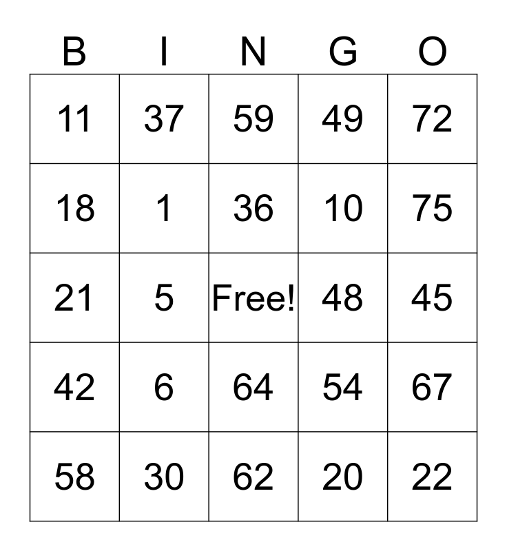 This bingo card has a free space and 24 words: 6, 30, 36, 58, 72, 11, 18, 37, 48, 64, 10, 21, 54, 67, 1, 20, 45, 59, 75, 5, 22, 42, 49 and 62.