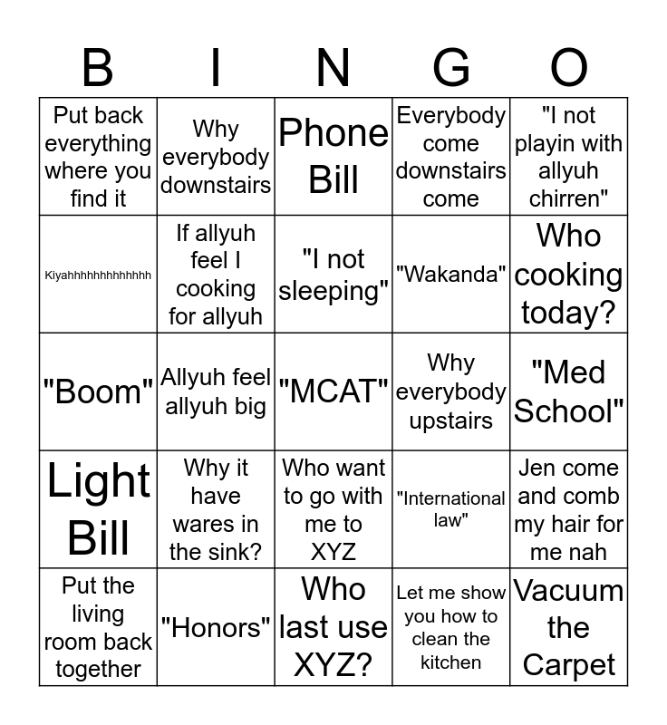 This bingo card has 25 words: Why it have wares in the sink?, Who last use XYZ?, "I not sleeping", Put the living room back together, "I not playin with allyuh chirren", Put back everything where you find it, Kiyahhhhhhhhhhhhh, Why everybody downstairs, Why everybody upstairs, Who want to go with me to XYZ, "Wakanda", "Boom", "International law", Jen come and comb my hair for me nah, If allyuh feel I cooking for allyuh, Vacuum the Carpet, "Med School", Phone Bill, Who cooking today?, Allyuh feel allyuh big, "MCAT", "Honors", Light Bill, Everybody come downstairs come and Let me show you how to clean the kitchen.
