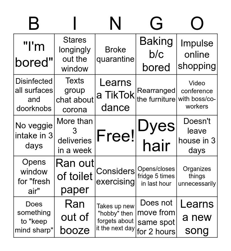 This bingo card has a free space and 25 words: Ran out of toilet paper, Takes up new "hobby" then forgets about it the next day, Learns a TikTok dance, Does something to "keep mind sharp", Impulse online shopping, "I'm bored", Disinfected all surfaces and doorknobs, Stares longingly out the window, Dyes hair, Considers exercising, Rearranged the furniture, No veggie intake in 3 days, Opens/closes fridge 5 times in last hour, Organizes things unnecessarily, Texts group chat about corona, Watched an entire season in 1 day, Doesn't leave house in 3 days, Broke quarantine, Video conference with boss/co-workers, More than 3 deliveries in a week, Learns a new song, Ran out of booze, Opens window for "fresh air", Baking b/c bored and Does not move from same spot for 2 hours.