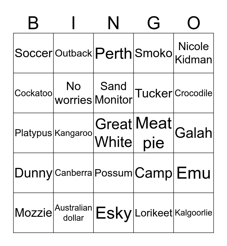 This bingo card has 86 words: Free!, Wallaby, Possum, Bilby, Brown Snake, Dugong, Ghost, Bat, Quokka, Cuscus, Tasmanian, Devil, Emu, Galah, Taipan, Sand Monitor, Sugar, Glider, Numbat, Echidna, Wombat, Bandicoot, Platypus, Rainbow, Lorikeet, Kookaburra, Dolphin, Stingray, Aussies, Australia, Australian dollar, Ayers rock, Boomerangs, Canberra, Cockatoo, Cricket, Crocodile, Dingo, Barrier Reef, Kangaroo, Koala, Kylie Minogue, Mate, Meat pie, Melbourne, Nicole Kidman, Opera house, Outback, Russell Crowe, Surfing, Sydney, Vegemite, Dunny, G’Day, Sheila, Barbie, Ripper, Tucker, Smoko, No worries, Soccer, Thongs, Anzac, Down Under, Freo, Perth, Harbour Bridge, Great White, Kalgoorlie, Broome, Arvo, Stubby, Mozzie, Kiwi, Bogan, Swag, Esky, Servo, Surf, Bathers, Uluru, Woolie’s, Ute, Sweet as, Camp and Aussie.