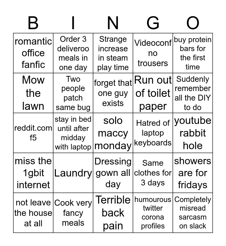 This bingo card has 25 words: Laundry, Terrible back pain, forget that one guy exists, not leave the house at all, buy protein bars for the first time, romantic office fanfic, Mow the lawn, Order 3 deliveroo meals in one day, Hatred of laptop keyboards, Dressing gown all day, Run out of toilet paper, reddit.com f5, Same clothes for 3 days, showers are for fridays, Two people patch same bug, Completely misread sarcasm on slack, youtube rabbit hole, Strange increase in steam play time, Suddenly remember all the DIY to do, stay in bed until after midday with laptop, solo maccy monday, Cook very fancy meals, miss the 1gbit internet, Videoconf no trousers and humourous twitter corona profiles.