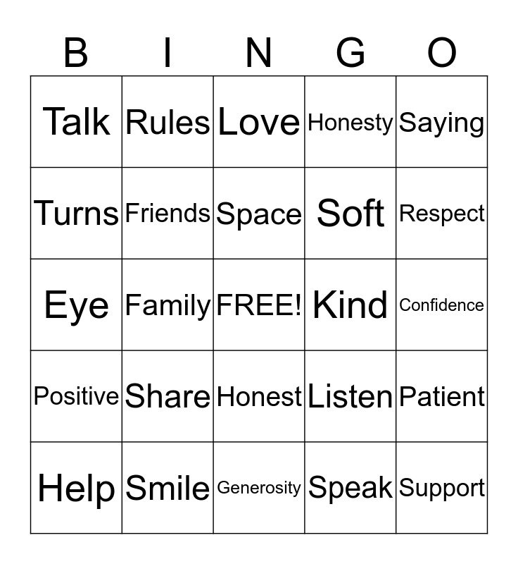 This bingo card has a free space and 24 words: Share, Smile, Space, Help, Saying, Talk, Turns, Rules, Kind, Honest, Soft, Eye, Listen, Patient, Friends, Speak, Confidence, Love, Respect, Family, Support, Positive, Honesty and Generosity.