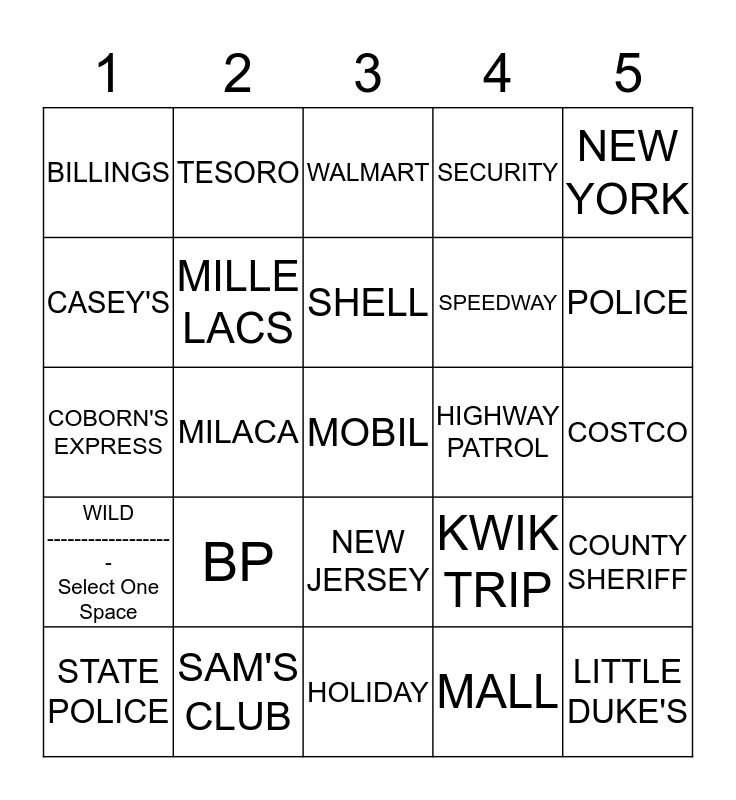 This bingo card has 25 words: BP, HOLIDAY, SHELL, STATE POLICE, NEW YORK, BILLINGS, CASEY'S, TESORO, HIGHWAY PATROL, NEW JERSEY, SPEEDWAY, COBORN'S EXPRESS, KWIK TRIP, COUNTY SHERIFF, MILLE LACS, LITTLE DUKE'S, COSTCO, WALMART, POLICE, MILACA, MOBIL, SAM'S CLUB, WILD ------------------- Select One Space, SECURITY and MALL.