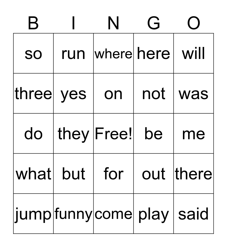 This bingo card has a free space and 24 words: but, funny, on, jump, will, so, three, run, be, for, not, do, out, there, yes, play, me, where, was, they, said, what, here and come.