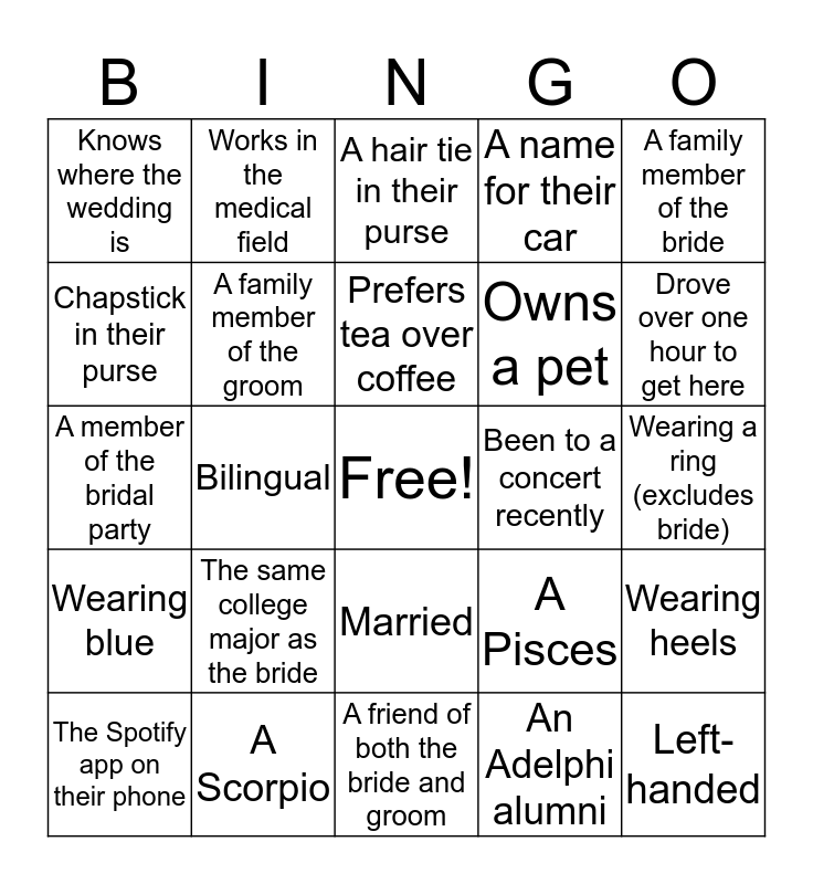 This bingo card has a free space and 24 words: The same college major as the bride, A Scorpio, Prefers tea over coffee, The Spotify app on their phone, A family member of the bride, Knows where the wedding is, Chapstick in their purse, Works in the medical field, Been to a concert recently, Married, Owns a pet, A member of the bridal party, A Pisces, Wearing heels, A family member of the groom, An Adelphi alumni, Wearing a ring (excludes bride), A hair tie in their purse, Drove over one hour to get here, Bilingual, Left-handed, Wearing blue, A name for their car and A friend of both the bride and groom.