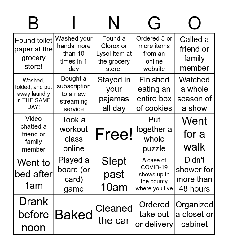 This bingo card has a free space and 29 words: Drank before noon, Finished a book, Took a workout class online, Went to the grocery store, Found toilet paper at the grocery store!, Found a Clorox or Lysol item at the grocery store!, Bought a subscription to a new streaming service, Played a board (or card) game, Put together a whole puzzle, Baked, Went for a walk, Organized a closet or cabinet, Cleaned the car, Ordered take out or delivery, Watched a whole season of a show, Tried making a new recipe, Slept past 10am, Went to bed after 1am, Called a friend or family member, Video chatted a friend or family member, A case of COVID-19 shows up in the county where you live, Finished eating an entire bag of chips, Finished eating an entire box of cookies, Washed, folded, and put away laundry in THE SAME DAY!, Ordered 5 or more items from an online website, Washed your hands more than 10 times in 1 day, Didn't shower for more than 48 hours, Stayed in your pajamas all day and Did NOT watch the news or read any articles about COVID-19 for a whole day.