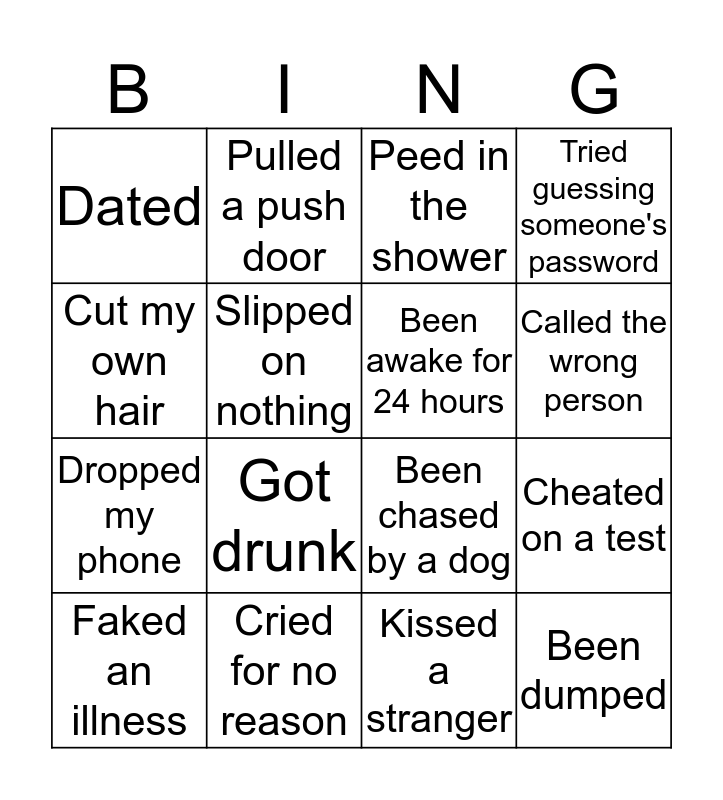 This bingo card has 16 words: Faked an illness, Cried for no reason, Peed in the shower, Tried guessing someone's password, Cut my own hair, Pulled a push door, Been chased by a dog, Cheated on a test, Dated, Slipped on nothing, Kissed a stranger, Called the wrong person, Dropped my phone, Got drunk, Been awake for 24 hours and Been dumped.