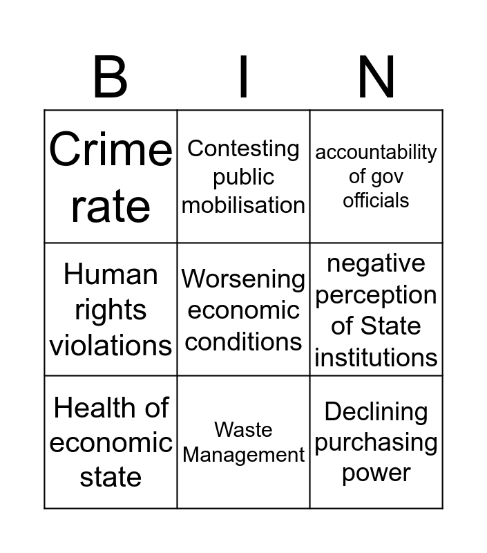 This bingo card has 11 words: Declining purchasing power, Waste Management, Worsening economic conditions, Health of economic state, Contesting public mobilisation, accountability of gov officials, negative perception of State institutions, Intra- Leb-Syrian tension, Human rights violations, Crime rate and increased vulnerability:Lebanese.