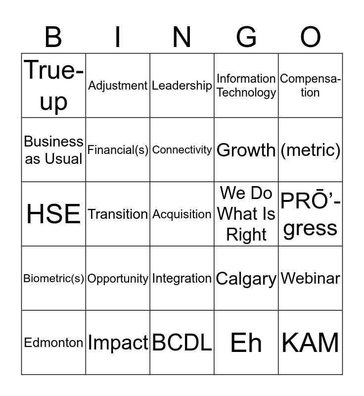 This bingo card has a free space and 24 words: Opportunity, Impact, Connectivity, Edmonton, Compensa-tion, True-up, Business as Usual, Adjustment, We Do What Is Right, Integration, Growth, HSE, Calgary, Webinar, Financial(s), Eh, PRŌ’-gress, Leadership, (metric), Transition, KAM, Biometric(s), Information Technology and BCDL.