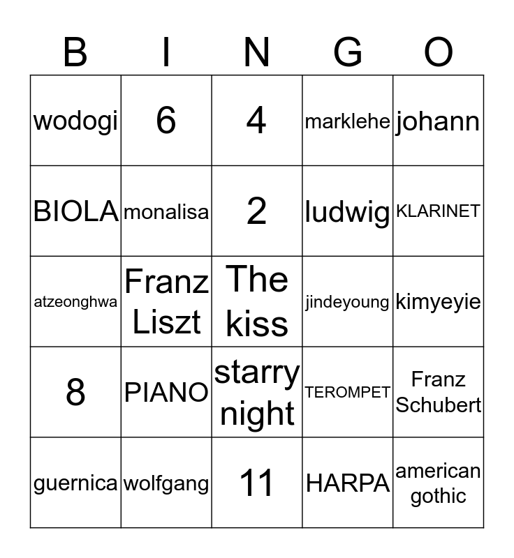 This bingo card has 25 words: PIANO, 11, 2, guernica, johann, wodogi, BIOLA, 6, jindeyoung, starry night, ludwig, atzeonghwa, TEROMPET, Franz Schubert, monalisa, american gothic, kimyeyie, 4, KLARINET, Franz Liszt, The kiss, wolfgang, 8, marklehe and HARPA.