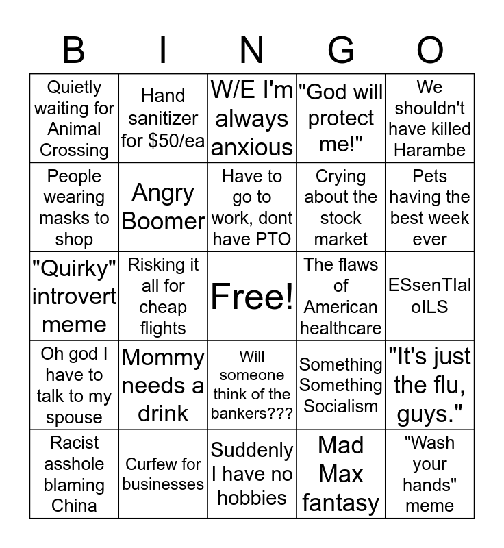 This bingo card has a free space and 24 words: Mommy needs a drink, Curfew for businesses, Have to go to work, dont have PTO, Racist asshole blaming China, We shouldn't have killed Harambe, Quietly waiting for Animal Crossing, People wearing masks to shop, Hand sanitizer for $50/ea, The flaws of American healthcare, Will someone think of the bankers???, Crying about the stock market, "Quirky" introvert meme, Something Something Socialism, "It's just the flu, guys.", Angry Boomer, Mad Max fantasy, ESsenTIal oILS, W/E I'm always anxious, Pets having the best week ever, Risking it all for cheap flights, "Wash your hands" meme, Oh god I have to talk to my spouse, "God will protect me!" and Suddenly I have no hobbies.