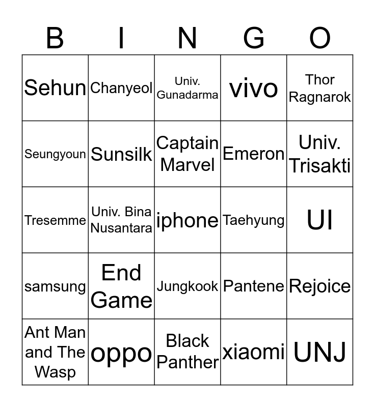This bingo card has 25 words: End Game, Black Panther, Captain Marvel, Ant Man and The Wasp, Thor Ragnarok, Sehun, Seungyoun, Chanyeol, Taehyung, Jungkook, Emeron, Tresemme, Pantene, Rejoice, Sunsilk, UNJ, UI, Univ. Gunadarma, Univ. Trisakti, Univ. Bina Nusantara, iphone, oppo, samsung, vivo and xiaomi.