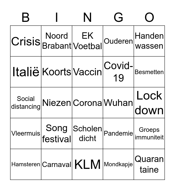 This bingo card has a free space and 29 words: Hamsteren, Paraceta mol, Niezen, RIVM, Crisis, EK Voetbal, Koorts, Song festival, Wuhan, Carnaval, Lock down, Quaran taine, KLM, Mondkapje, Besmetten, WHO, Scholen dicht, Vleermuis, Handen wassen, Social distancing, Pandemie, Virus, Covid-19, Italië, Ouderen, Noord Brabant, Groeps immuniteit, Vaccin and China.