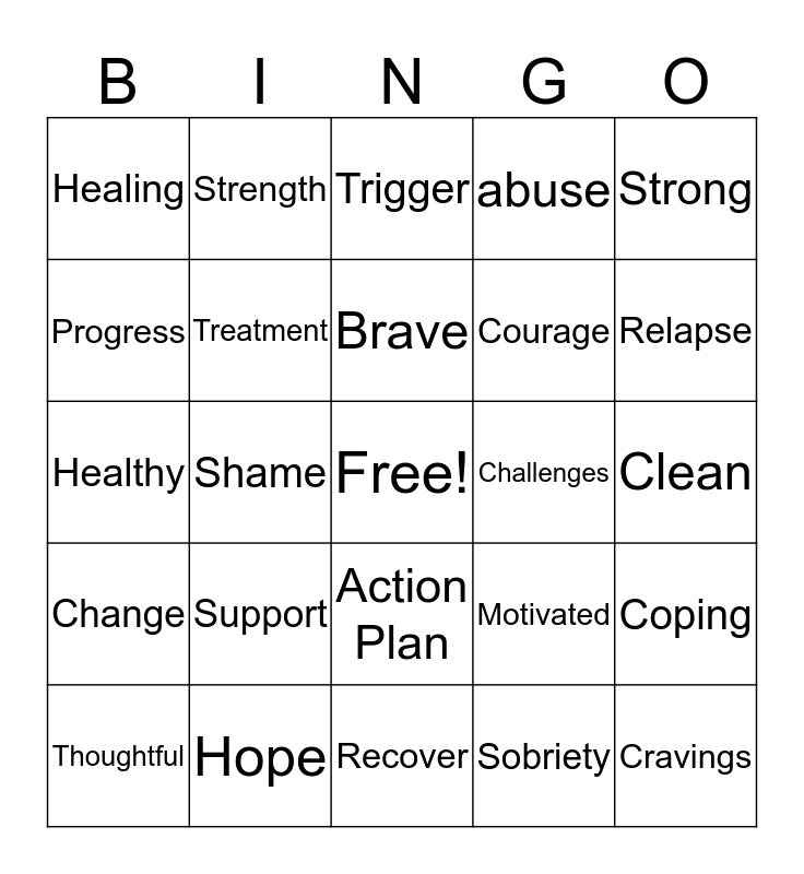 This bingo card has a free space and 24 words: Support, Hope, Brave, Thoughtful, Strong, Healing, Progress, Strength, Challenges, Action Plan, Courage, Healthy, Motivated, Coping, Treatment, Sobriety, Clean, Trigger, Relapse, Shame, Cravings, Change, abuse and Recover.