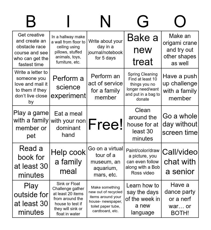 This bingo card has a free space and 24 words: Help cook a family meal, Sink or Float Challenge gather at least 20 items from around the house to test if they will sink or float in water, Perform an act of service for a family member, Play outside for at least 30 minutes, Make an origami crane and try out other shapes as well, Get creative and create an obstacle race course and see who can get the fastest time, Write a letter to someone you love and mail it to them if they don’t live close by, In a hallway make a wall from floor to ceiling using pillows, stuffed animals, toys, furniture, etc., Clean around the house for at least 30 minutes, Go on a virtual tour of a museum, an aquarium, mars, etc., Spring Cleaning Find at least 10 things you no longer need/want and put in a bag to donate, Play a game with a family member or pet, Paint/color/draw a picture, you can even follow along with a Bob Ross video, Call/video chat with a senior, Perform a science experiment, Learn how to say the days of the week in a new language, Go a whole day without screen time, Write about your day in a journal/notebook for 5 days, Have a push up challenge with a family member, Eat a meal with your non dominant hand, Have a dance party or a nerf war… or BOTH!, Read a book for at least 30 minutes, Bake a new treat and Make something new out of recycled items around your house- newspaper, toilet paper tube, cardboard, etc..