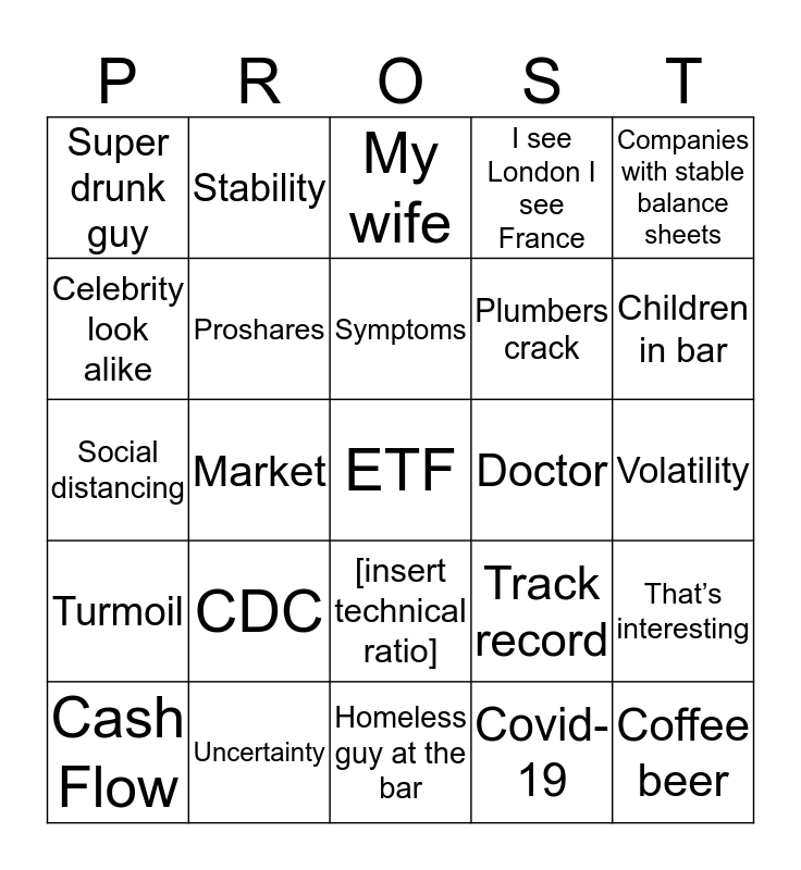 This bingo card has a free space and 32 words: Covid-19, Petcare, Market, Dividend growers, Turmoil, Proshares, Companies with stable balance sheets, That’s interesting, Stability, Liquidity, Symptoms, My wife, Confidence, Sell-off, Doctor, Toilet paper, Cash Flow, Social distancing, [insert technical ratio], CDC, Track record, Circuit-breaker, Volatility, Uncertainty, Coffee beer, I see London I see France, Plumbers crack, Celebrity look alike, Super drunk guy, Homeless guy at the bar, Pool table and Children in bar.