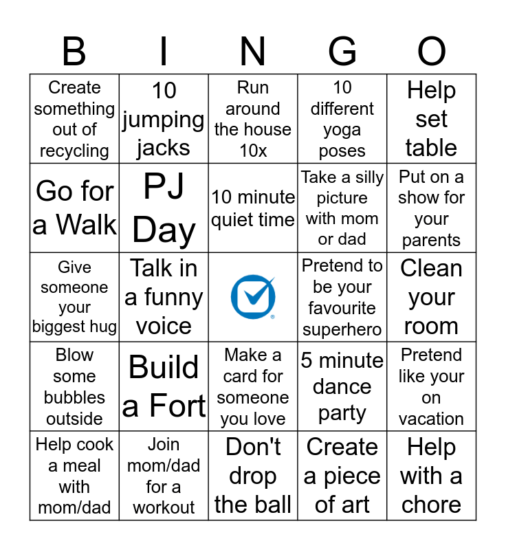 This bingo card has a free space and 24 words: Build a Fort, Join mom/dad for a workout, 10 minute quiet time, Help cook a meal with mom/dad, Help set table, Create something out of recycling, Go for a Walk, 10 jumping jacks, Pretend to be your favourite superhero, Make a card for someone you love, Take a silly picture with mom or dad, Give someone your biggest hug, 5 minute dance party, Pretend like your on vacation, PJ Day, Create a piece of art, Clean your room, Run around the house 10x, Put on a show for your parents, Talk in a funny voice, Help with a chore, Blow some bubbles outside, 10 different yoga poses and Don't drop the ball.