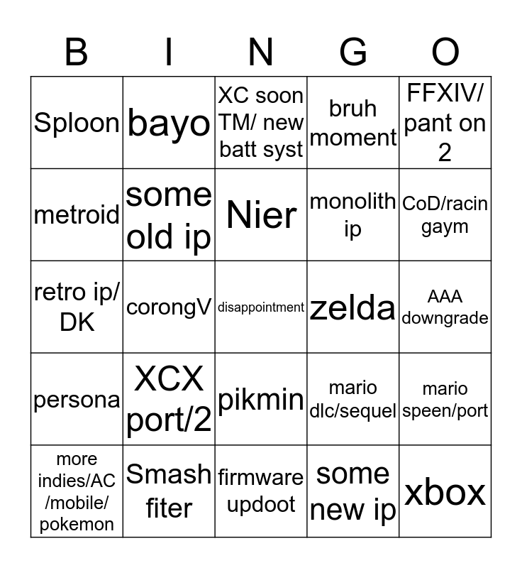 This bingo card has a free space and 24 words: XCX port/2, Smash fiter, Nier, more indies/AC /mobile/ pokemon, FFXIV/ pant on 2, Sploon, metroid, bayo, zelda, pikmin, monolith ip, retro ip/ DK, mario dlc/sequel, mario speen/port, some old ip, some new ip, AAA downgrade, XC soon TM/ new batt syst, CoD/racin gaym, corongV, xbox, persona, bruh moment and firmware updoot.