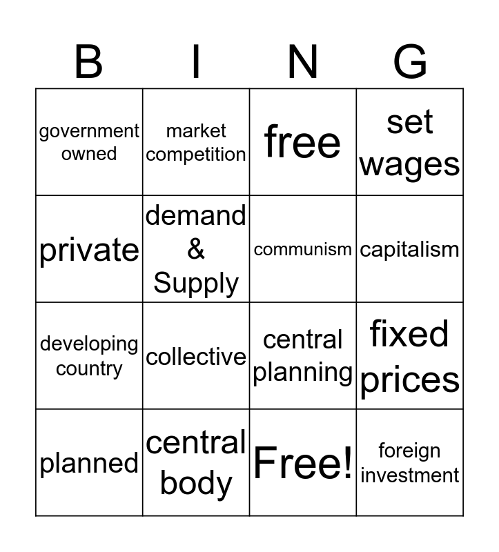 This bingo card has 17 words: Free!, planned, free, government owned, collective, set wages, fixed prices, communism, capitalism, demand & Supply, central body, central planning, private, market competition, developing country, developed country and foreign investment.