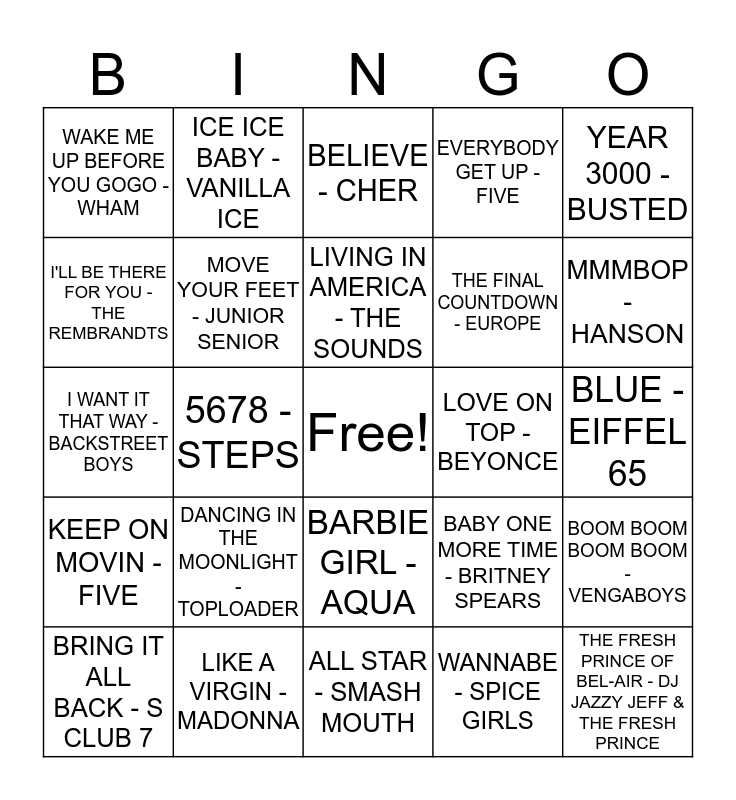 This bingo card has a free space and 26 words: BARBIE GIRL - AQUA, WANNABE - SPICE GIRLS, LIVING IN AMERICA - THE SOUNDS, LIKE A VIRGIN - MADONNA, YEAR 3000 - BUSTED, WAKE ME UP BEFORE YOU GOGO - WHAM, I'LL BE THERE FOR YOU - THE REMBRANDTS, ICE ICE BABY - VANILLA ICE, BLUE - EIFFEL 65, BABY ONE MORE TIME - BRITNEY SPEARS, THE FINAL COUNTDOWN - EUROPE, I WANT IT THAT WAY - BACKSTREET BOYS, BOOM BOOM BOOM BOOM - VENGABOYS, BRING IT ALL BACK - S CLUB 7, 5678 - STEPS, WHO LET THE DOGS OUT - BAHA MEN, EVERYBODY GET UP - FIVE, KEEP ON MOVIN - FIVE, BELIEVE - CHER, THE FRESH PRINCE OF BEL-AIR - DJ JAZZY JEFF & THE FRESH PRINCE, MMMBOP - HANSON, ALL STAR - SMASH MOUTH, LOVE ON TOP - BEYONCE, DANCING IN THE MOONLIGHT - TOPLOADER, MOVE YOUR FEET - JUNIOR SENIOR and CALL ME MAYBE - CARLY RAE JEPSEN.