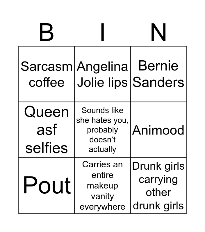 This bingo card has a free space and 8 words: Animood, Bernie Sanders, Angelina Jolie lips, Pout, Sarcasm coffee, Drunk girls carrying other drunk girls, Queen asf selfies and Carries an entire makeup vanity everywhere.