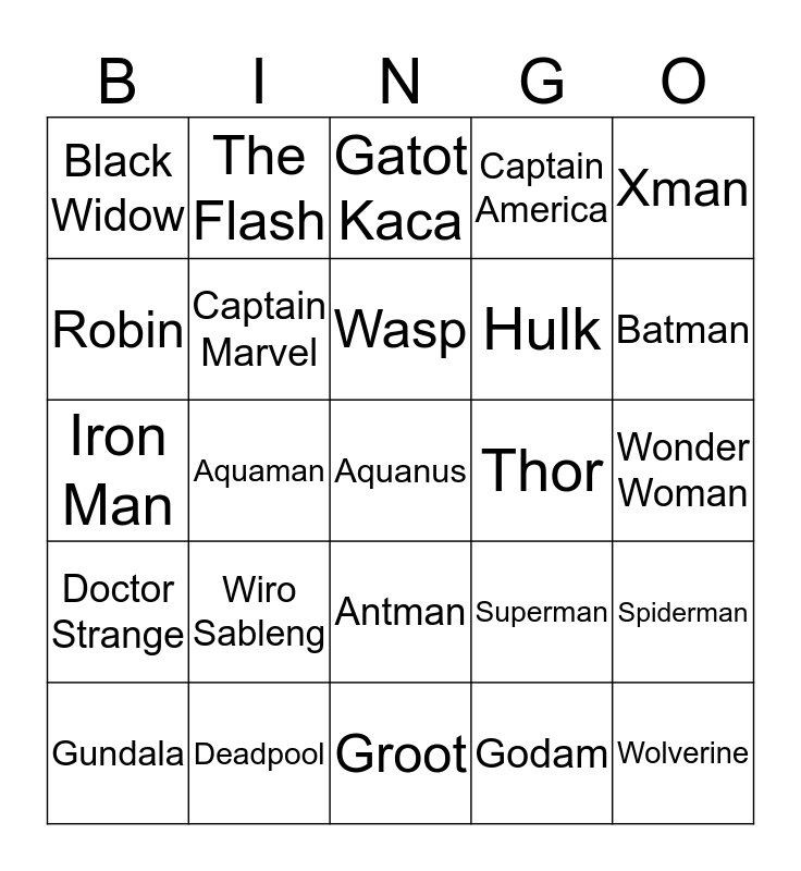 This bingo card has 25 words: Wiro Sableng, Groot, Wasp, Gundala, Xman, Black Widow, Robin, The Flash, Thor, Antman, Hulk, Iron Man, Superman, Spiderman, Captain Marvel, Wolverine, Wonder Woman, Gatot Kaca, Batman, Aquaman, Aquanus, Deadpool, Doctor Strange, Captain America and Godam.