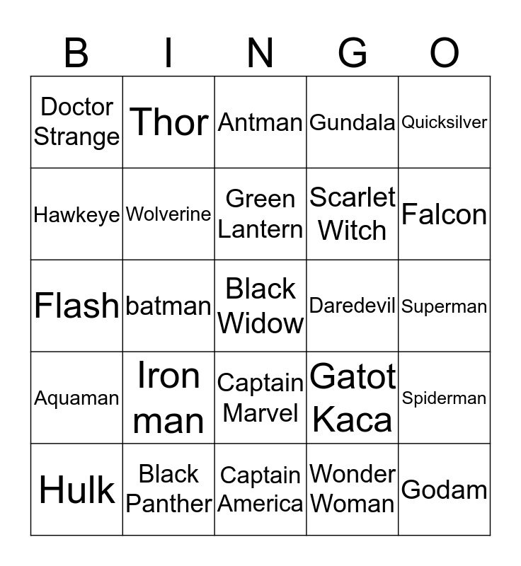 This bingo card has 25 words: Iron man, Captain America, Green Lantern, Hulk, Quicksilver, Doctor Strange, Hawkeye, Thor, Daredevil, Captain Marvel, Scarlet Witch, Flash, Gatot Kaca, Spiderman, Wolverine, Godam, Superman, Antman, Falcon, batman, Black Widow, Black Panther, Aquaman, Gundala and Wonder Woman.