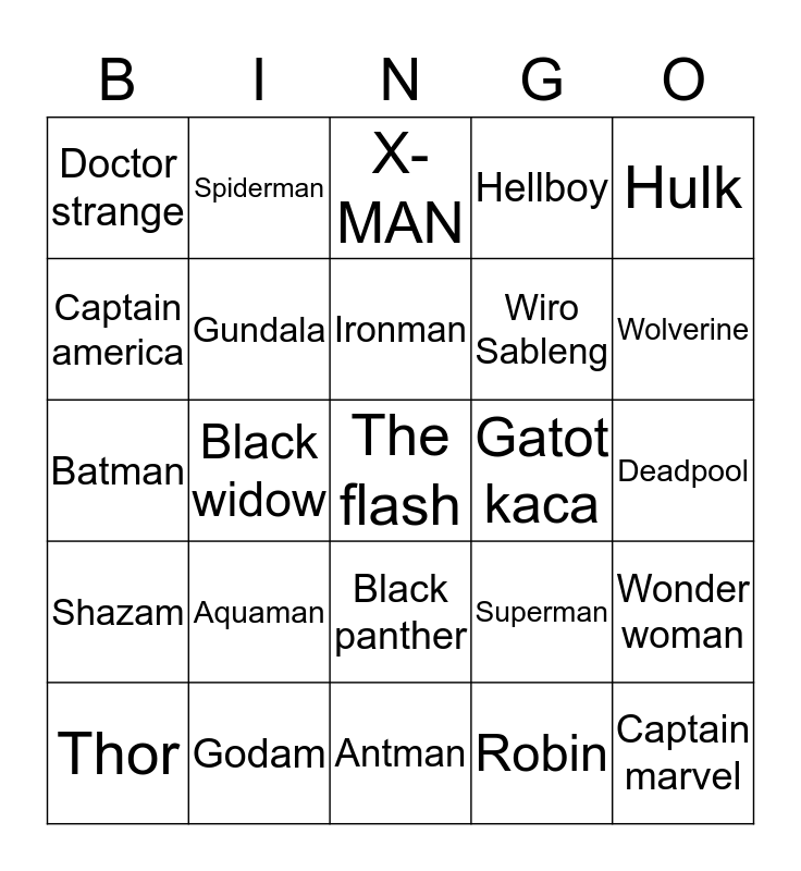 This bingo card has 25 words: Aquaman, Antman, Ironman, Thor, Hulk, Doctor strange, Captain america, Spiderman, Gatot kaca, Black panther, Wiro Sableng, Batman, Superman, Wonder woman, Gundala, Captain marvel, Deadpool, X-MAN, Wolverine, Black widow, The flash, Godam, Shazam, Hellboy and Robin.