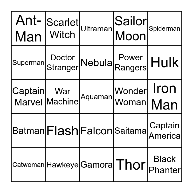 This bingo card has 25 words: Flash, Gamora, Nebula, Catwoman, Spiderman, Ant-Man, Superman, Scarlet Witch, Wonder Woman, Falcon, Power Rangers, Captain Marvel, Saitama, Captain America, Doctor Stranger, Black Phanter, Iron Man, Ultraman, Hulk, War Machine, Aquaman, Hawkeye, Batman, Sailor Moon and Thor.