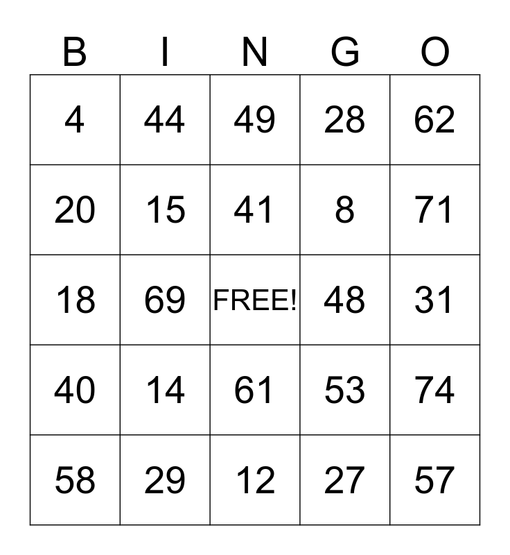 This bingo card has a free space and 24 words: 14, 29, 41, 58, 62, 4, 20, 44, 48, 61, 8, 18, 53, 74, 15, 27, 31, 49, 71, 69, 57, 40, 28 and 12.