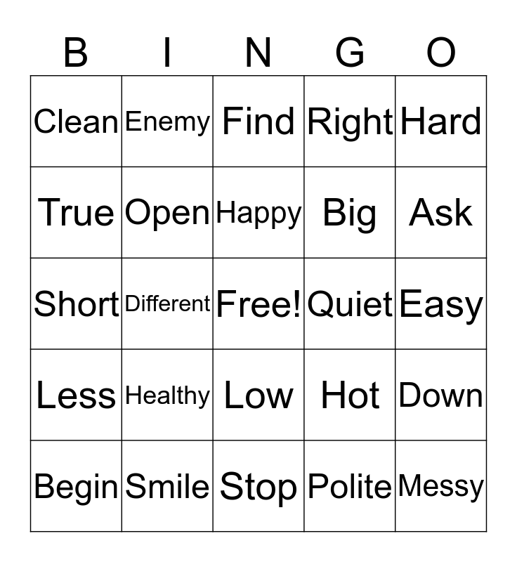 This bingo card has a free space and 24 words: Healthy, Smile, Happy, Begin, Hard, Clean, True, Enemy, Quiet, Low, Big, Short, Hot, Down, Open, Polite, Easy, Find, Ask, Different, Messy, Less, Right and Stop.